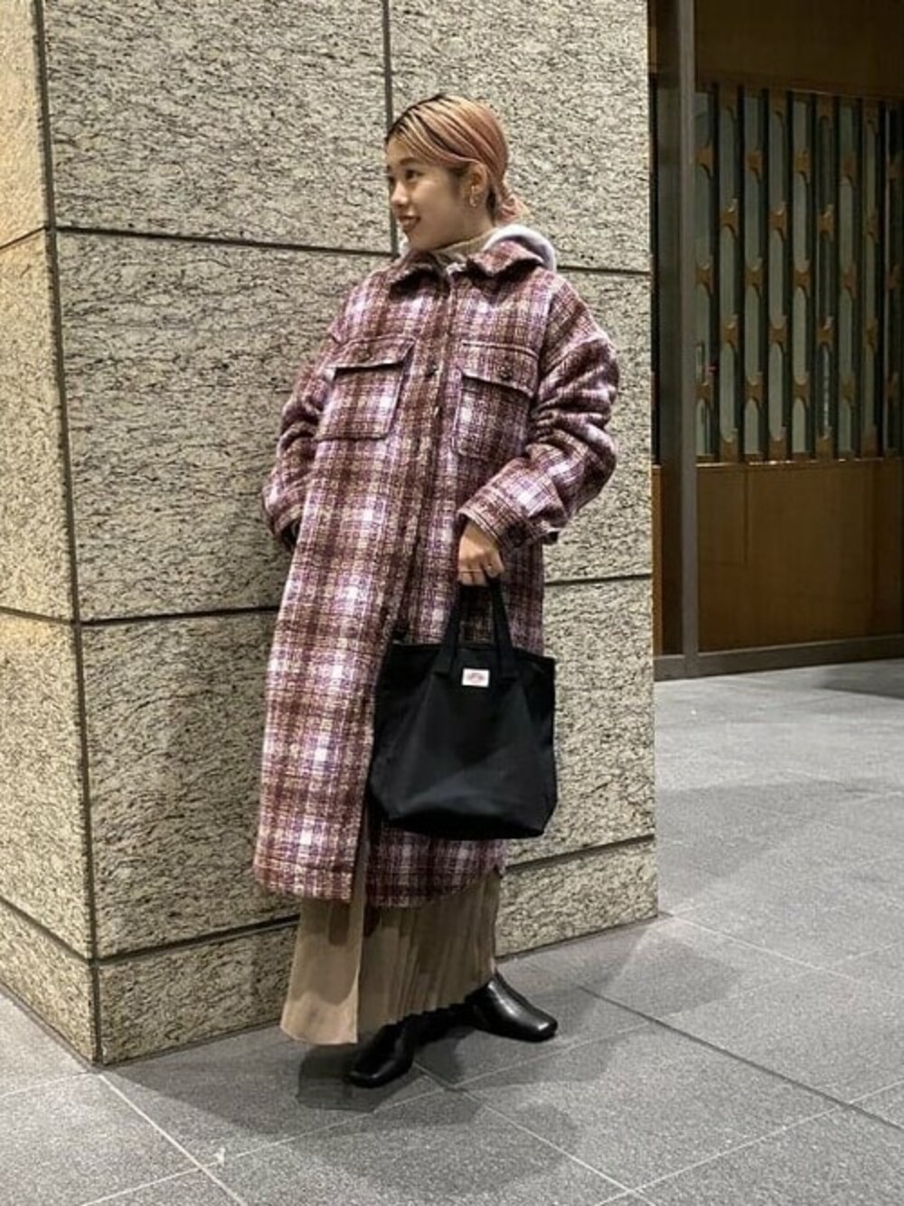 カラーが可愛いチェックのコートにフードのついたトップスでカジュアルに♡