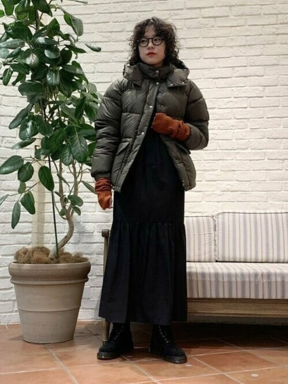 <THE NORTH FACE>の軽量ダウンは撥水性にも優れてます!黒のワンピースですっきり着てみました。