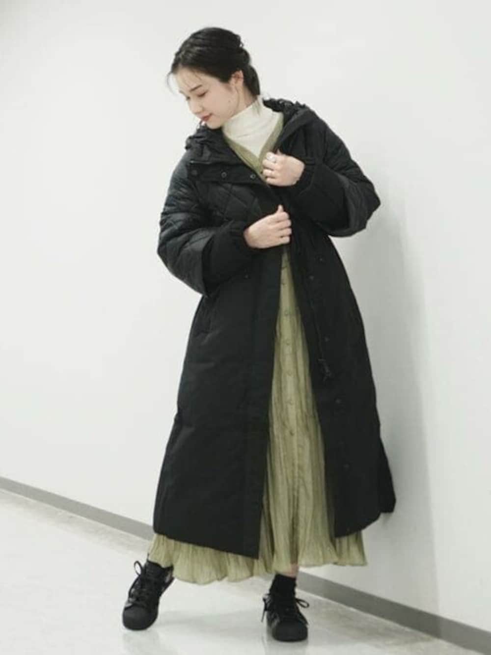 防寒もおしゃれも諦められない!という時におすすめなのが<DUVETICA>のこちらのダウン。切り替えのデザインが素敵です…! 中のワンピースもプリーツで縦ラインを強調してスッキリと◎