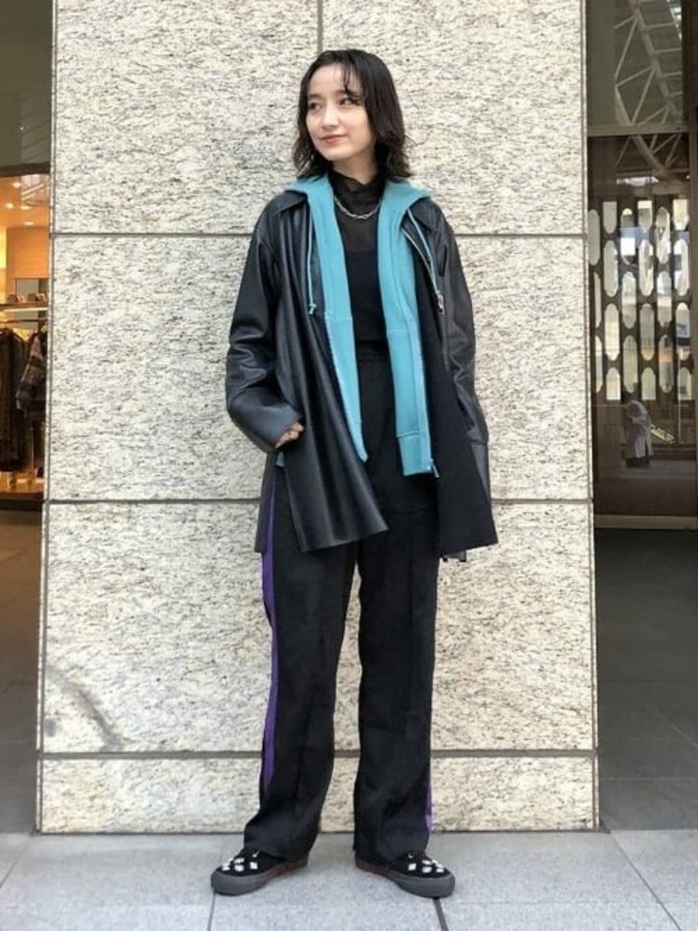 レザーシャツのインナーに<Champion>のパーカーをレイヤードしました♪鮮やかなミントグリーンがブラックコーディネートに映えます☆
