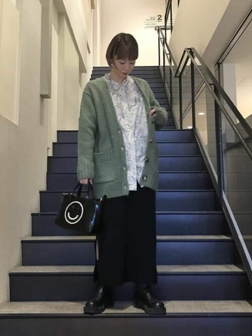 綺麗な緑色のカーディガンを主役に、後はシンプルにコーディネイトしました^_^ お尻まですっぽり隠れる丈感で暖かく、アウターの下に着込むのにもちょうど良い厚みです。毎年人気のECODECOの新作をポイントに!
