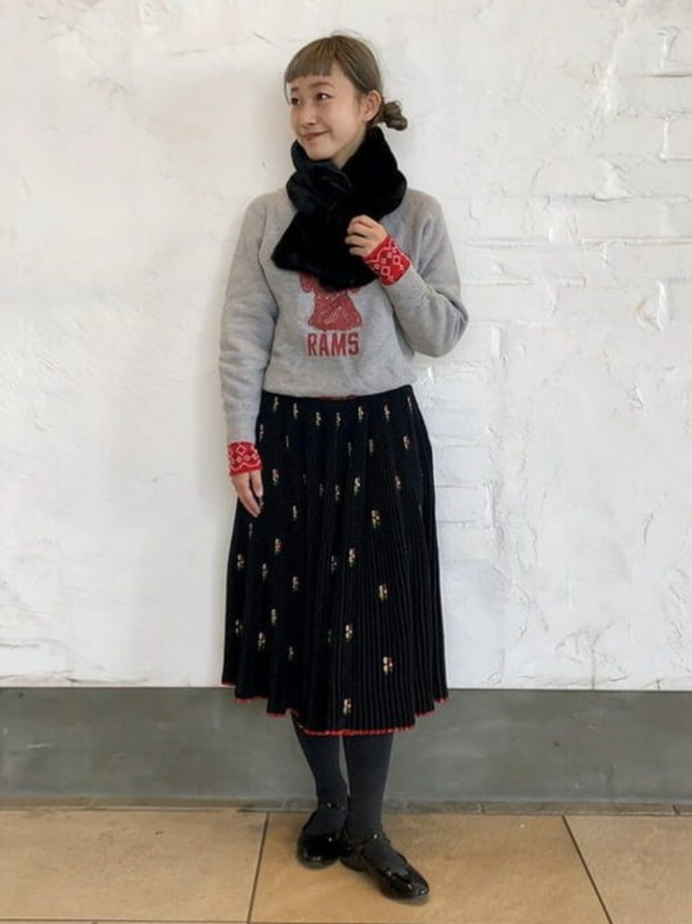 差し色赤でまとめました!マフラーは肌の弱い私でも肌に優しく気持ちいいです。