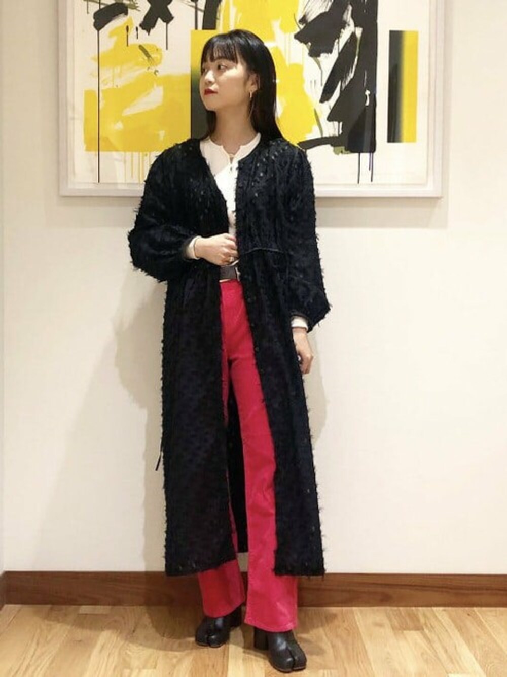 <Ray BEAMS>フリンジジャガードワンピースをメインにスタイリング。インパクトのある<RED CARD>×<Ray BEAMS>のパンツと合わせて、少しエッジの効いた印象になるように意識しました。