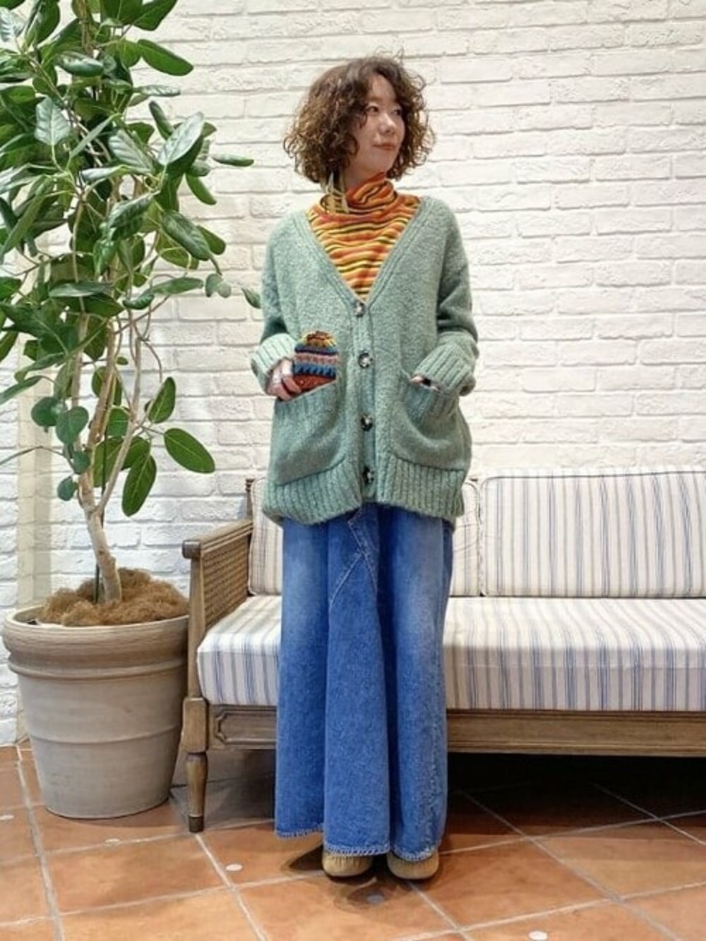やさしい色合いのカーディガンにオレンジをさしました。<UGG>のモカシンはボトムから頭が覗くくらいで履きたいです。30%OFFで買うならいま~!