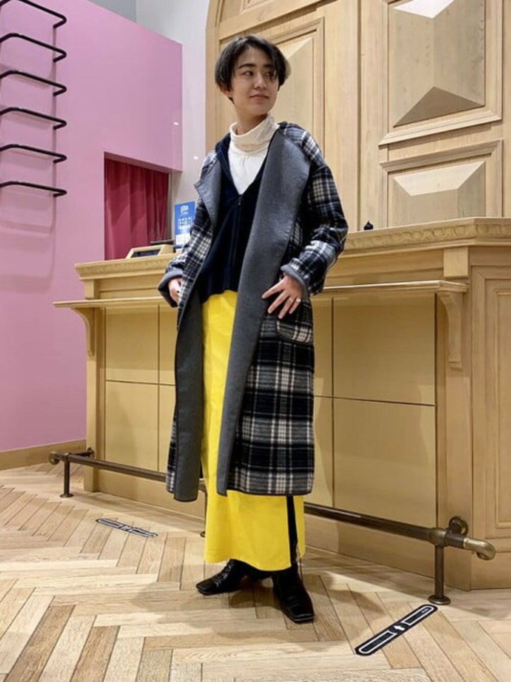 チェック柄のラップコートに〈champion〉のパーカーを合わせて、カジュアルな感じを出してみました。差し色にイエローカラーのデニムスカートを合わせました。