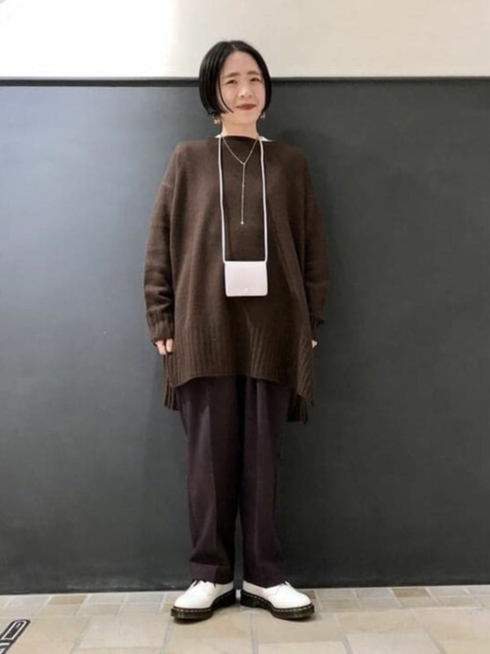 ブラウン系でまとめてみました♪ 差し色でラベンダーの財布を首にかけて、足元もホワイトの<Dr.martens>で明るめに! <Dr.martens>は<Ray BEAMS>別注でホワイトのみお求めやすくなっていますよ〜
