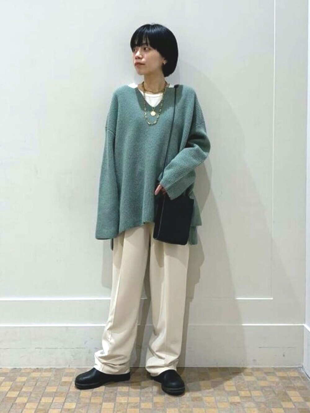 【私のイチオシSpecial priceアイテム】は、こちらのニットとタートルネック! シンプルでゆったりしているので、レイヤードが可能!しかもVネックなので、首回りを綺麗に見せることができます。ボトムの裾をあえてブーツに溜めています。長めが気分です。