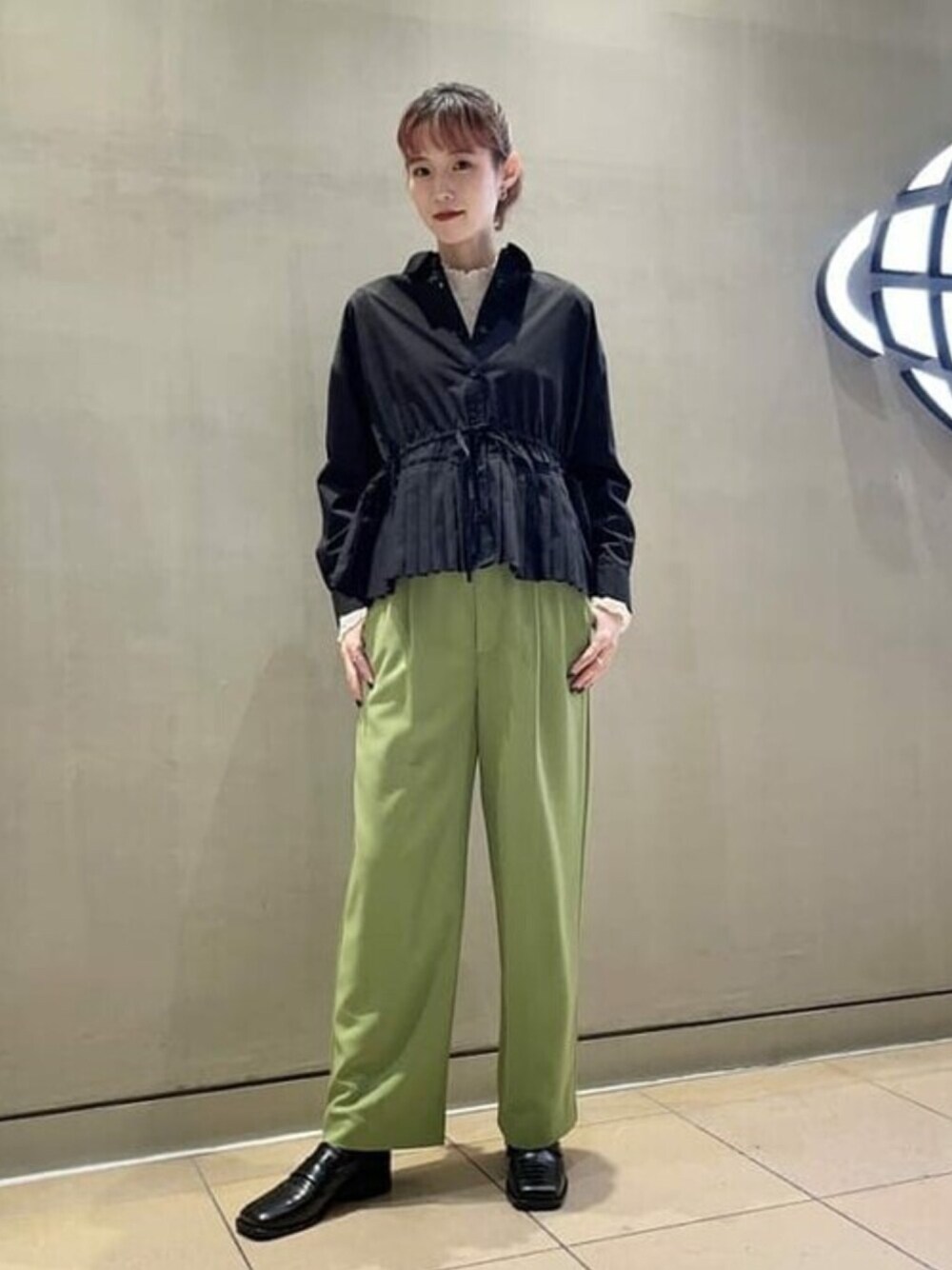 綺麗なグリーンのパンツが入荷しました!私は164cmで0サイズを着用しています。ウエストは背中部分がゴムになっているので、楽で履きやすいのに形がキレイでオススメです!インナーに着ているシャーリングのトップスはレイヤードで大活躍しそうです!