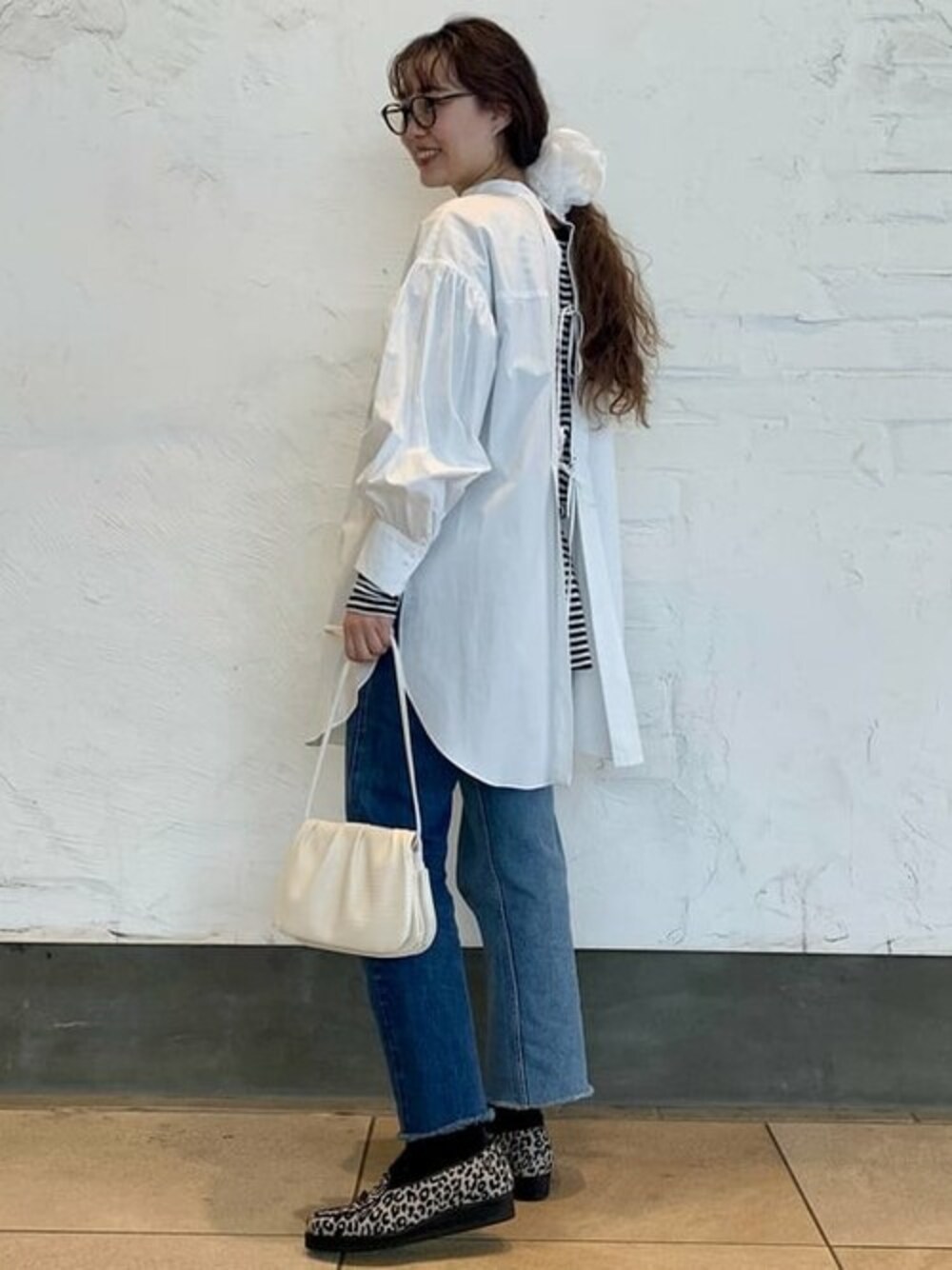 バッグリボンのブラウスを主役に。前後着用してインナーで楽しめそうです。