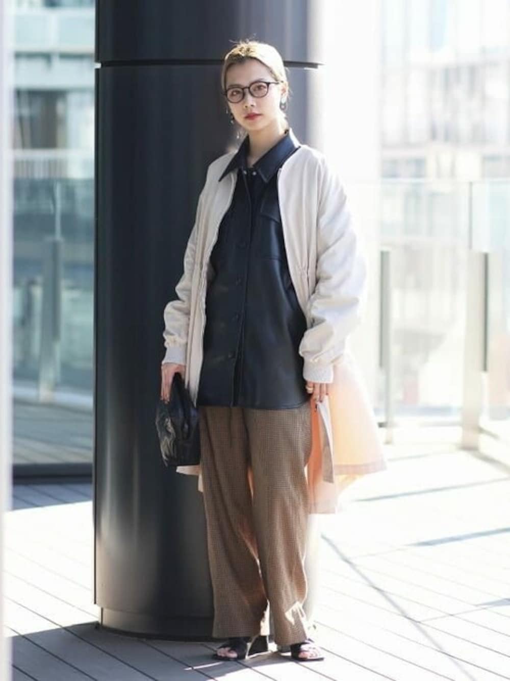〈Ray BEAMS〉オリジナルアイテムを盛り沢山なスタイリングです。フェイクレザーCPOジャケットは私的お気に入りアイテム、強くなりすぎないようにコートを甘く。伊達眼鏡で大人っぽく♡