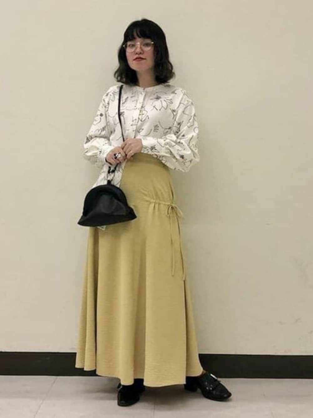 イエローのスカートと、サラッとしたシャツで、春のお出かけコーディネートにしました。スカートのサイドにリボンがついているので、シャツの前を半分だけインして、見せるように◎この時期なら上からスウェット、ベストを着て頂くのも素敵です☺︎
