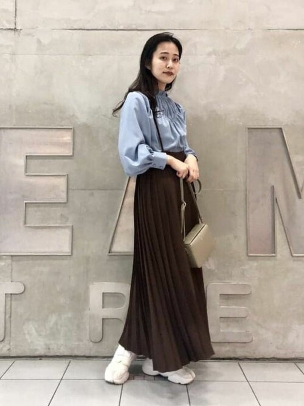 【今からでも着用できる可愛いブラウス】コットン見えするポリエステル素材のブラウス。シワになりにくく、お取り扱いしやすいのがポイント! ボリュームスリーブとギャザーのデザインがなんとも可愛いです♡ クラシカルな印象なのでスニーカーで少し外してみました。