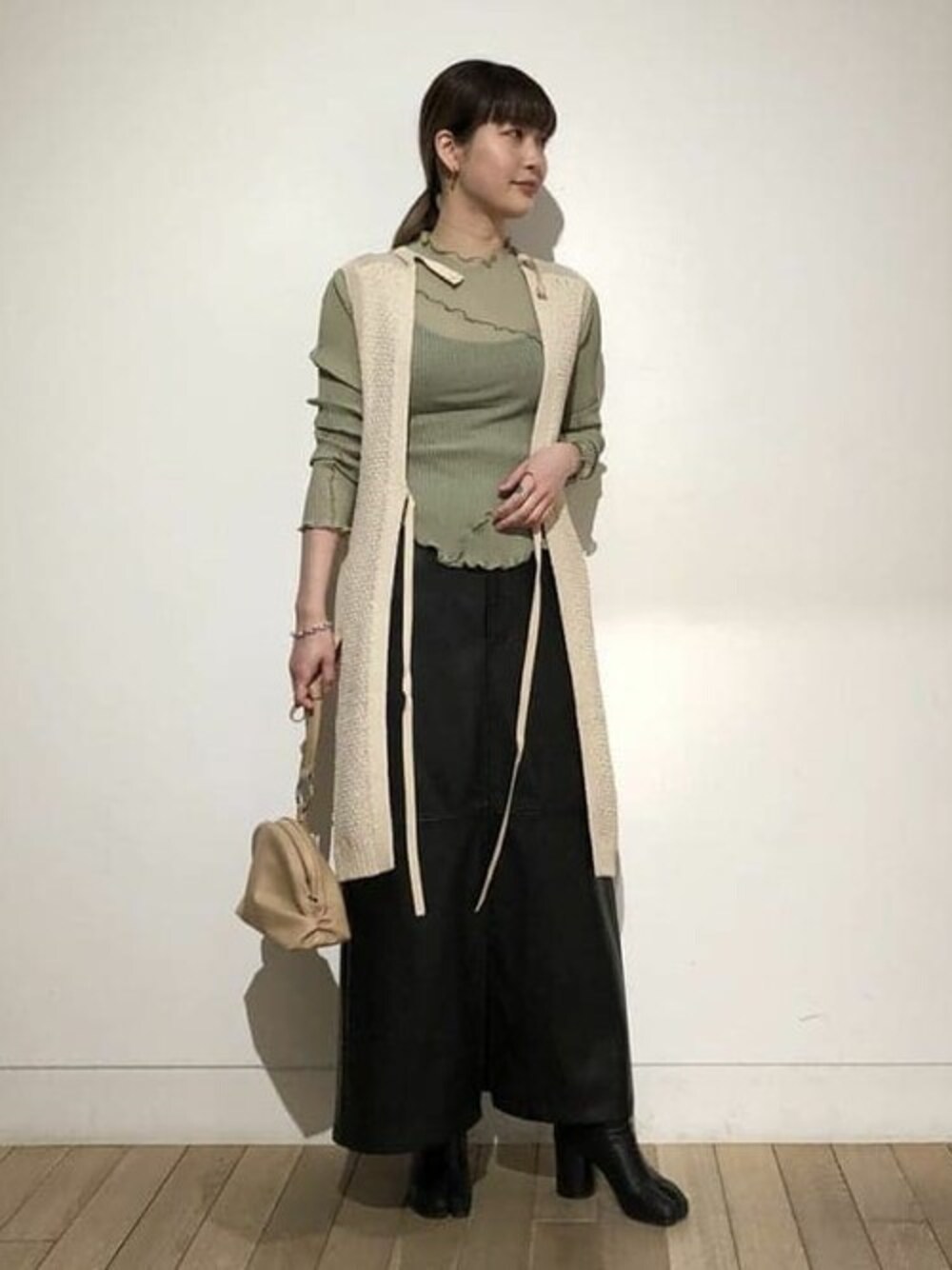 【RBS】 バッグオープンベストをあえて前で着用しジレ風にしてみました。 紐の垂れる感じが個人的にはとても好みでした。 中に合わせたシアーのトップスは今季のトレンドにもバッチリマッチしていて、全色欲しいくらいお気に入りandオススメです☆