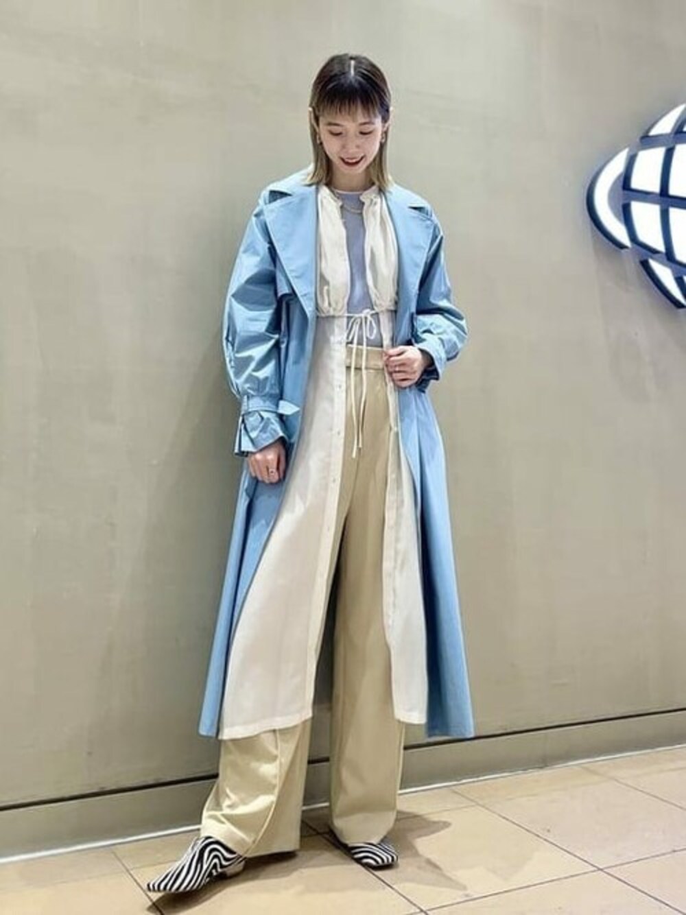 春らしいブルーの主張がありつつも、全体をふんわりしたトーンでまとめました。アクセントとして、ゼブラ柄のミュールがポイントです!ワンピースはウエストで絞れる紐があるので、一枚でレイヤードを楽しめます♪
