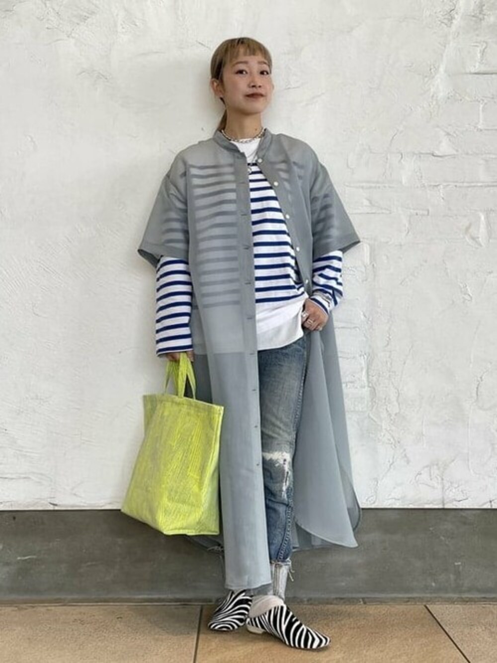 今日もシアーです。ブルーのボーダーにブルーのシアーワンピを重ねて春の爽やかさを意識しました。この袖の長さがいいです!爽やか過ぎるのも苦手なので首元をシルバーで纏めてます。