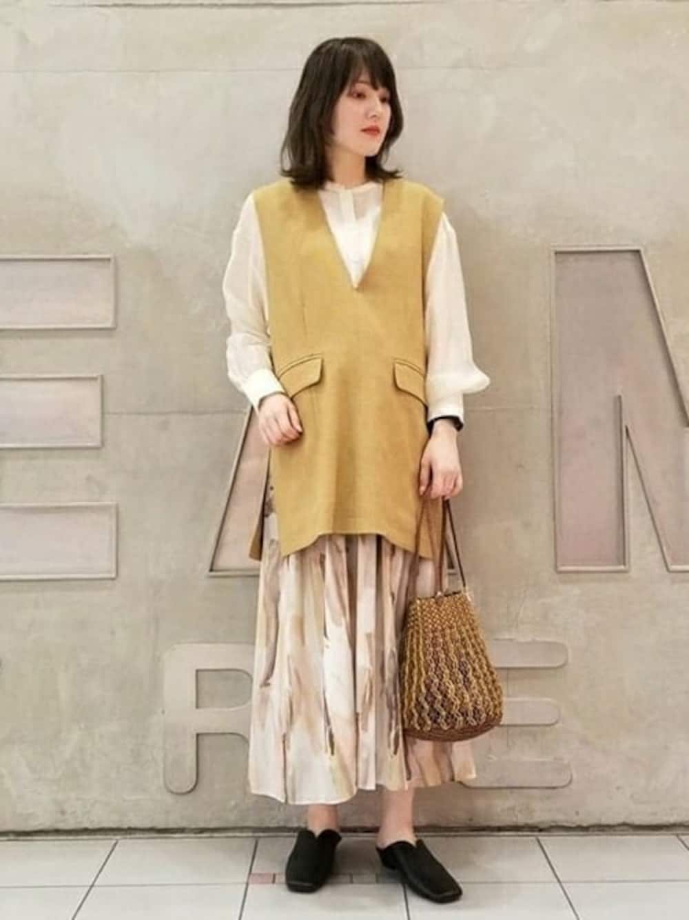 すっきりとした首元のベストは、合わせるインナーやボトムスによってきれいめにもカジュアルにも雰囲気を変えられます◎ 幅広く着回せるのでおすすめです! 今日は<Ray BEAMS>オリジナルプリントが可愛いスカートと合わせました♪