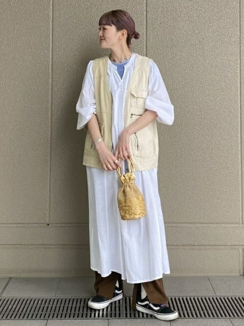 【ピクニックコーデ】袖のボリュームがふわっと軽くて可愛いワンピースをメインにスタイリングしました!インナーのベロアのブルーがポイントです♪