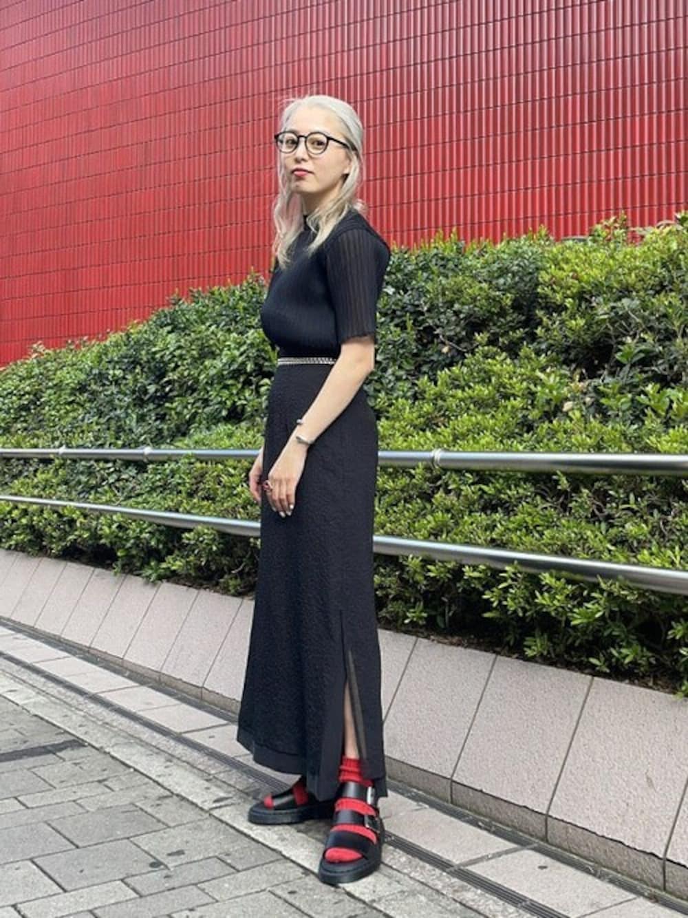 【イメージは大人カジュアル】トップスの透け感やスカートのスリットで、大人っぽさをアピール+赤やシルバーを差し色に取り入れカジュアルさも忘れないのがポイント!