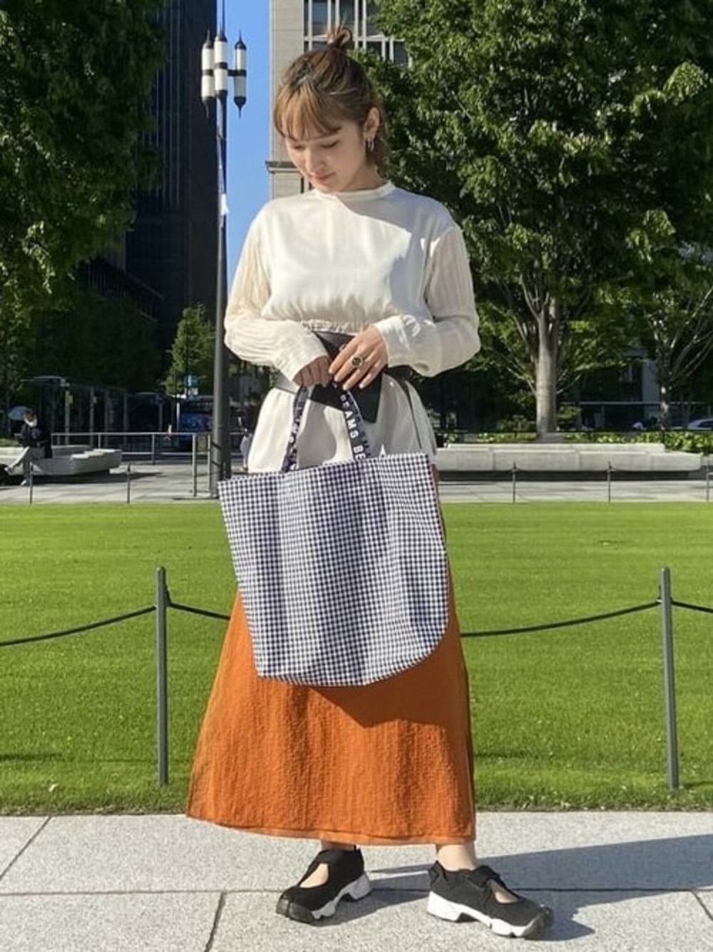 オレンジのスカートが主役のスタイルです★両サイドにスリットが入っていてとってもシルエットが綺麗です◎人気のエアリフトを合わせました!通気性もよく、軽すぎて歩きやすいです!