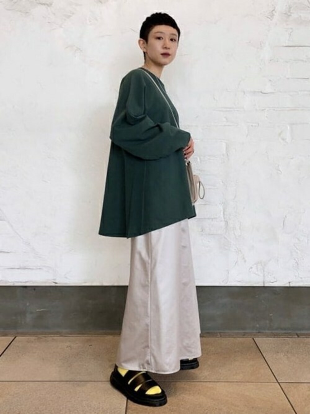 <Champion>別注のロンTは、後ろの裾と袖のタックが可愛いポイントです!長め丈×長め丈の合わせですが152cmでもバランスよく★リラックス感のあるコーディネートなので、ポイントにビタミンカラーのソックスを合わせました。