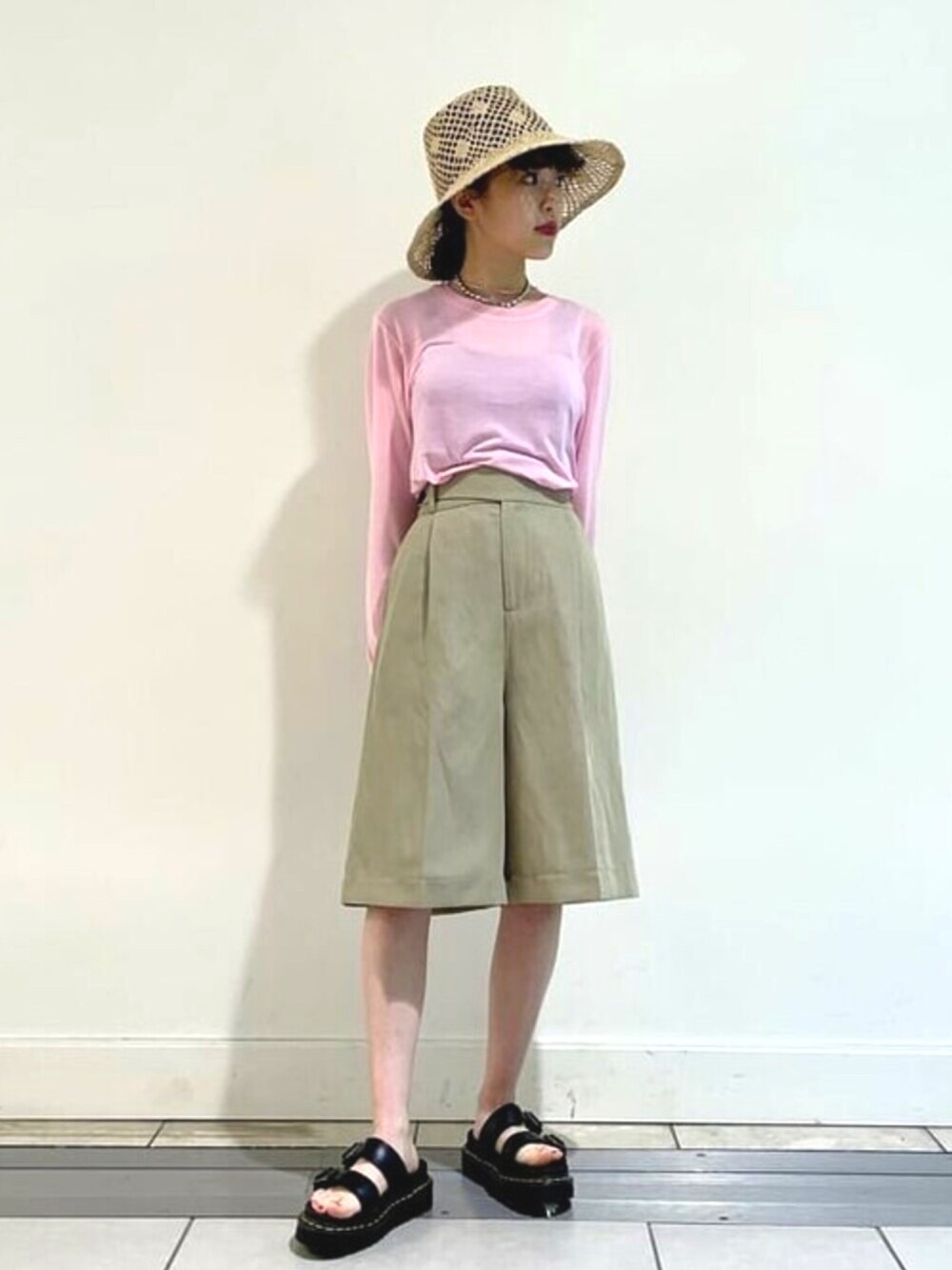 ハーフパンツ、丈感が絶妙でかわいいです♡ 全体的に淡い色味だったので、 足元は <Dr.Martens>のサンダルで引き締めました!