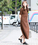 レース編みのニットキャミソールを女性らしいシルエットのワンピースにレイヤードしました。ブラウン×ブラックで落ち着いた雰囲気にまとめて、スカーフも添えてとことん女の子らしく◎