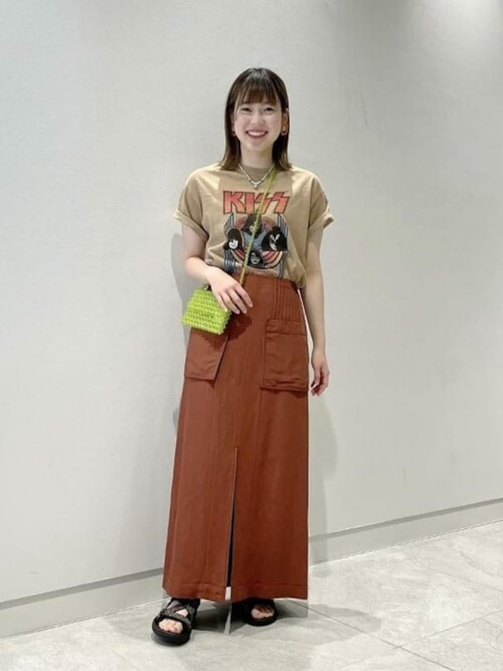 バンドTにスカート合わせで、甘さをプラスしました!ビーズネックレスやビーズバッグで差し色も加わり、遊び心のあるスタイリングです◎