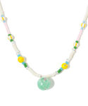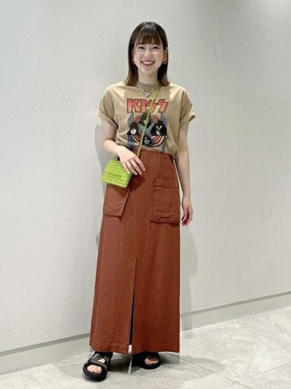バンドTにスカート合わせで、甘さをプラスしました!ビーズネックレスやビーズバッグで差し色も加わり、遊び心のあるスタイリングです◎