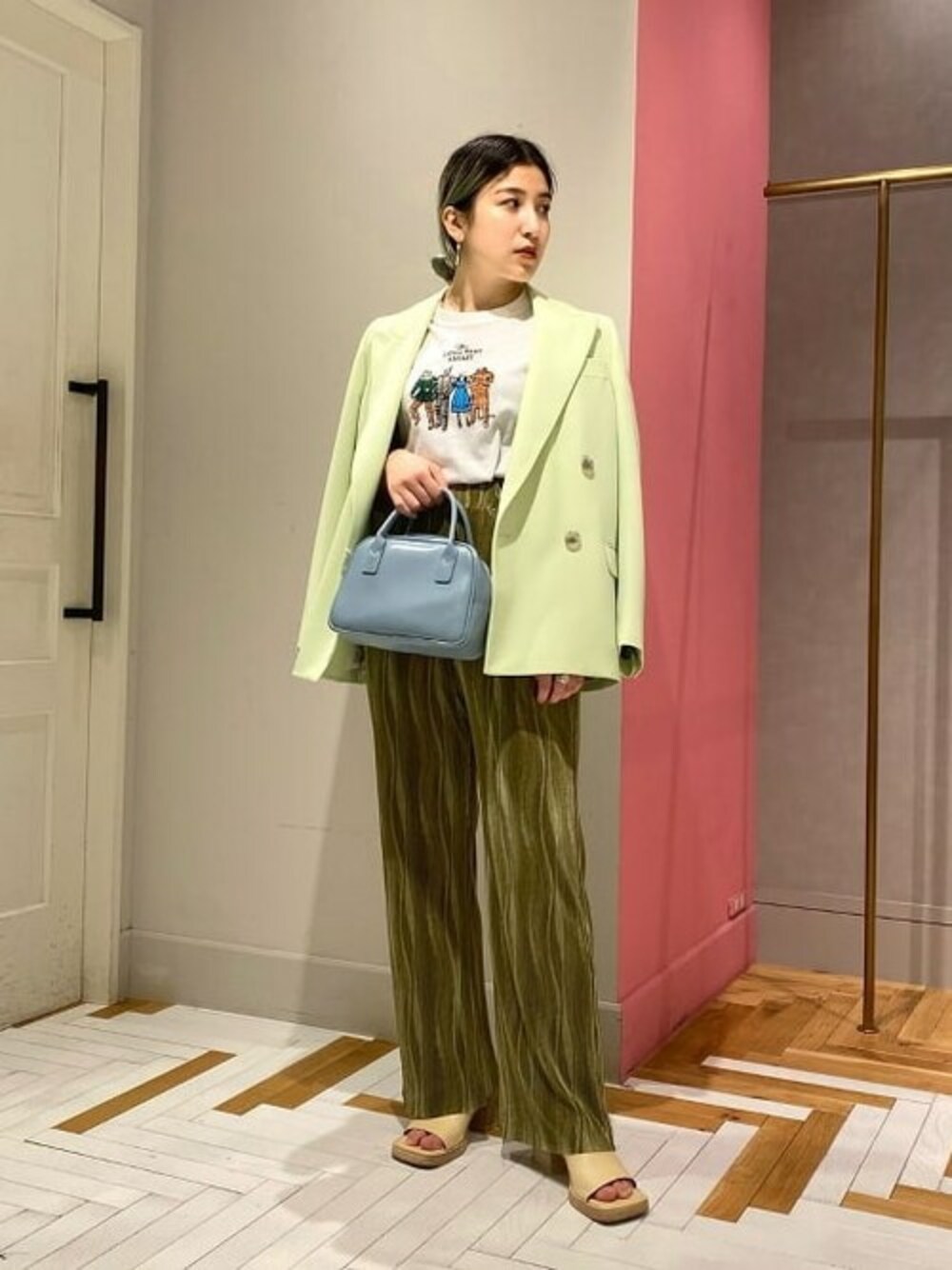 Tシャツに、easyパンツ、サンダルでラフにしつつ、ジャケットでピリッとアクセントを。 〈ACNE STUDIOS〉のジャケットは毎シーズン欲しくなってしまいます。。。 ニュアンスカラーでまとめて、統一感を!