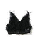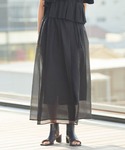 オールブラックのレイヤードコーディネートです。透け感のあるニット、チュール、オーガンジー、パンツのドットとカラーは同じでも素材やデザインで遊び心を♡
