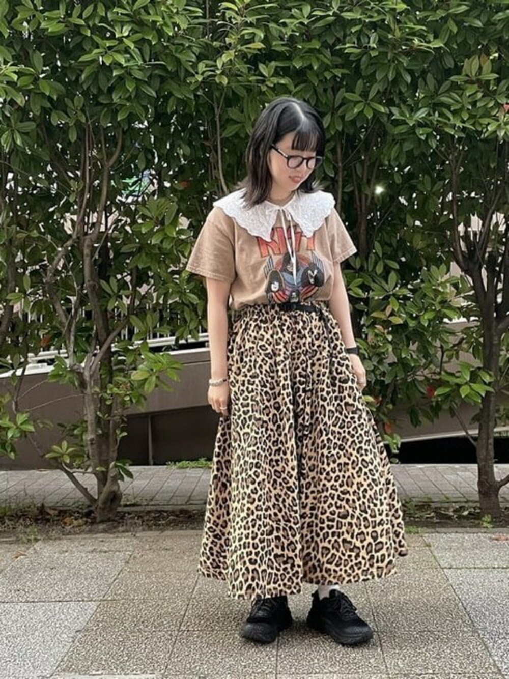 強めのレオパードはふんわりシルエットのスカートで可愛く、ハードなプリントのTシャツは襟を着けてこちらも可愛らしく!! 私的ベージュワントーンコーデです!!!