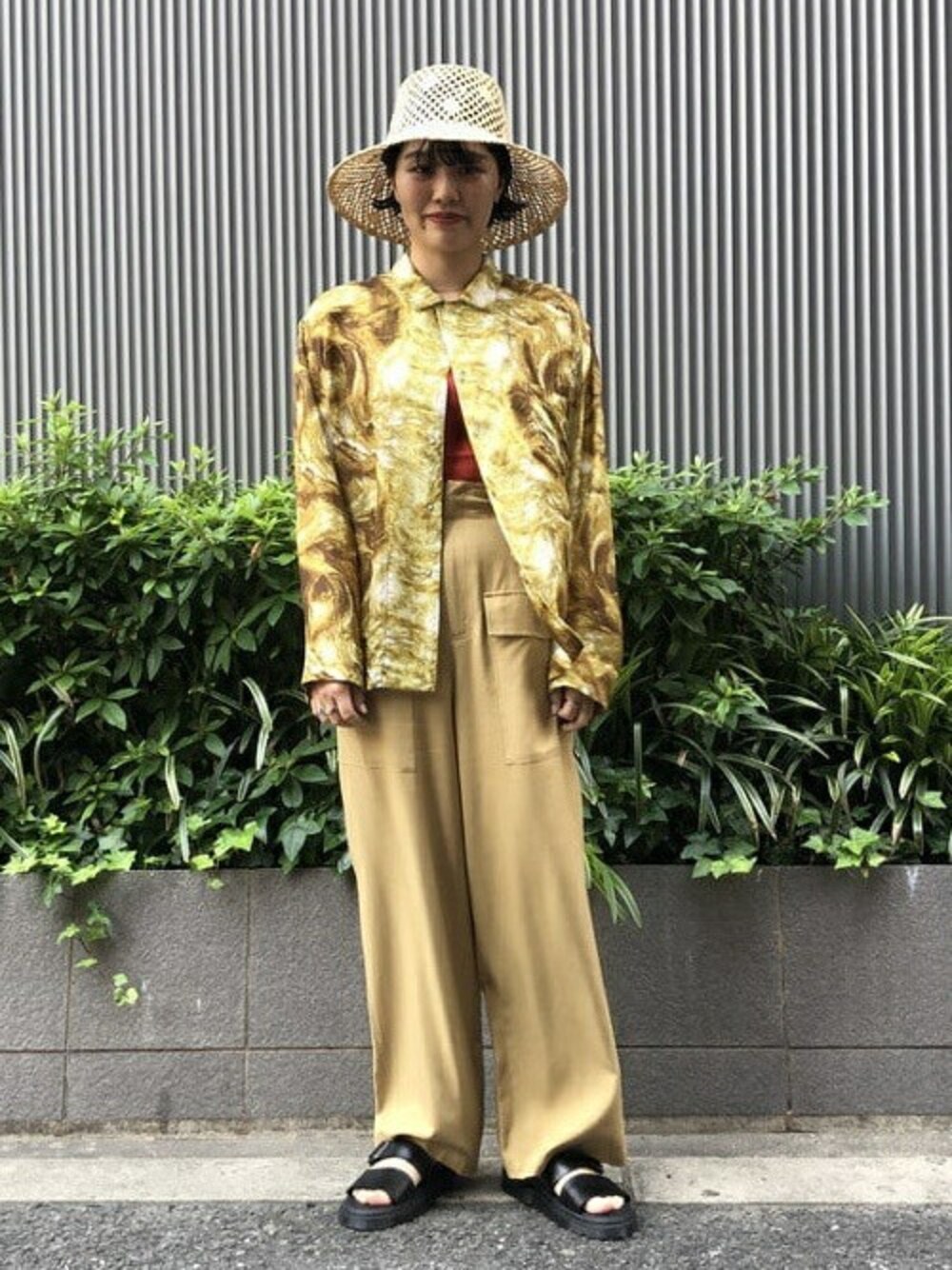 【ワントーンスタイリング】 柄の存在感抜群なシャツを、全体的にシンプルな合わせにしました。大きめの帽子を被ったので、アクセサリーはあえて無しに!足元はサンダルで軽く見せつつ、黒で締めました。