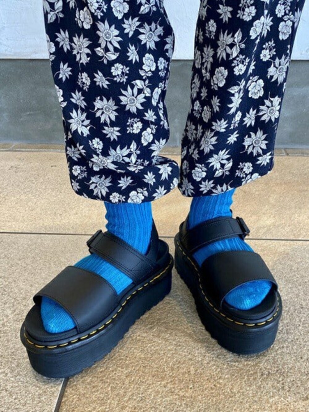 ブルー系コーデの足元に<Dr.Martens(ドクターマーチン)>の厚底サンダル♪ イエローのステッチとブルーのコントラストがお気に入りです◎