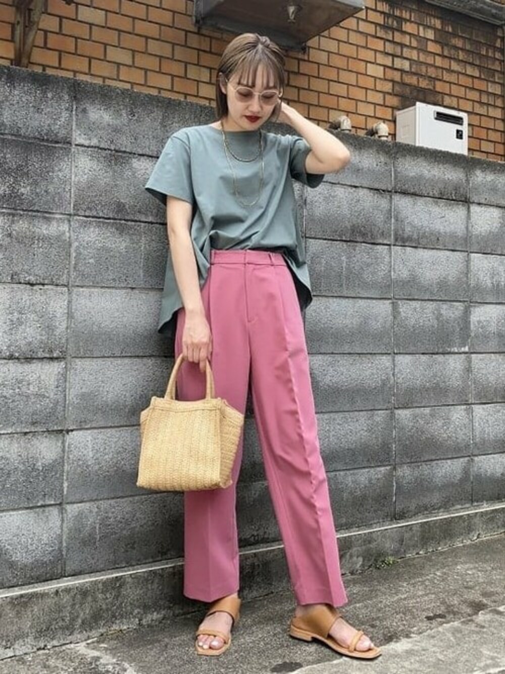 【くすみカラー×ビビットカラー】今回はトップスもボトムスもカラーアイテムでスタイリングしてみました!くすみカラーはビビットなはっきりしたカラーとの組み合わせが意外と合う! 小物も絶妙カラーが大人なサングラスをプラスしてスタイリッシュに。