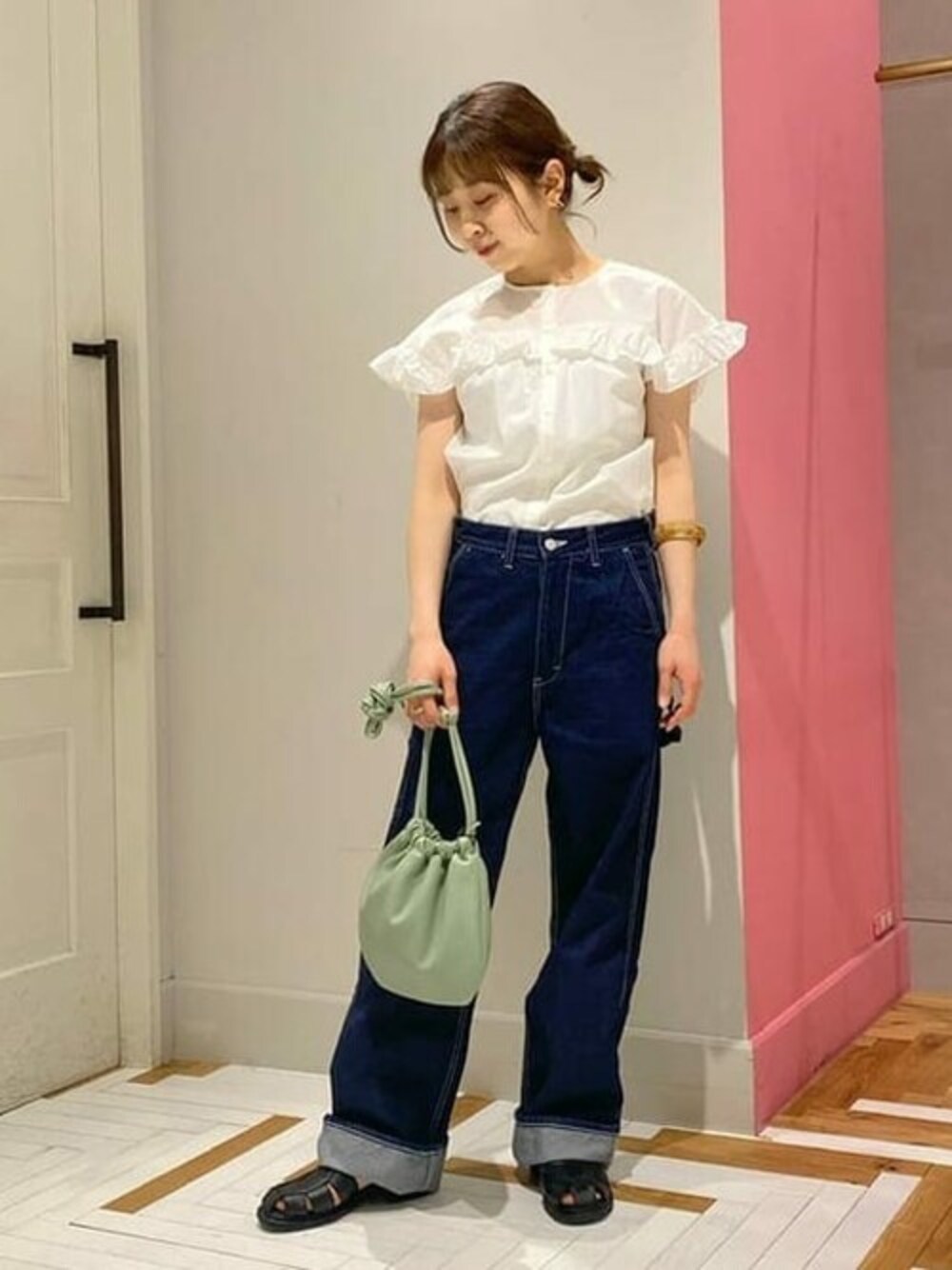 袖のディテールに一目惚れしました。。。こうゆうふんわりしたお袖が、大好物です。シンプルな合わせですが、今年のトレンドカラーのミントグリーンを差し色に、爽やかな色合わせです〜。