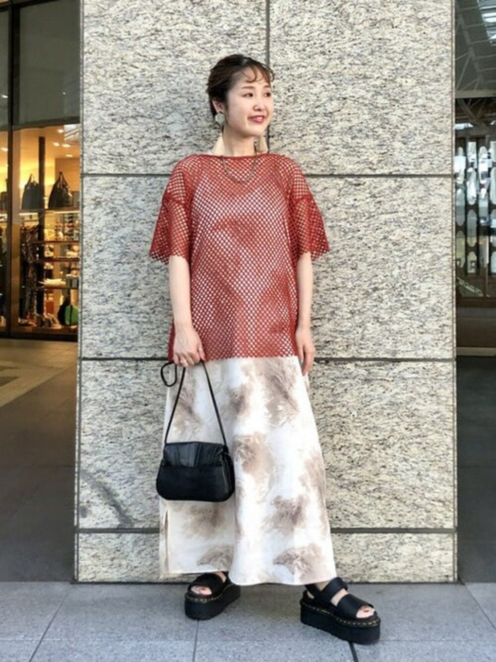 メッシュTシャツ、いつものスタイリングにプラスで合わせると雰囲気がぐっと変わっておすすめですっ♡ 今日はワンピースの上から着用しました。 Dr.Martensのサンダルは厚底なのでスタイルUP効果抜群! こちらもこの夏おすすめの商品ですっ♡
