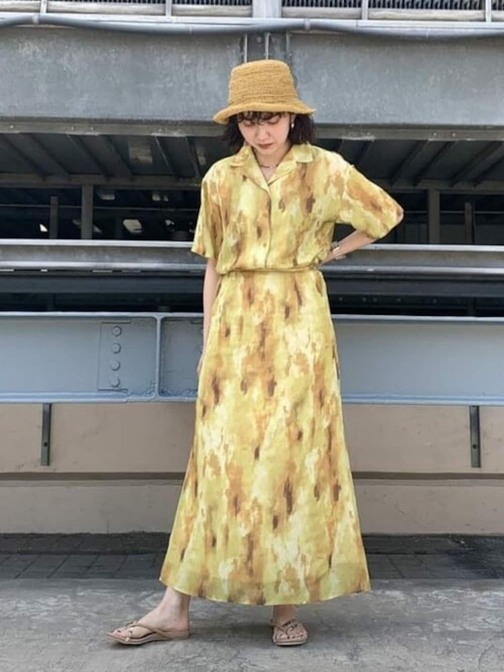 セットアップをワンピース風に着てみました〜! サンダルとハットで夏らしさ全開! 全体的にビタミンカラーで気分が上がるコーディネートです☺︎