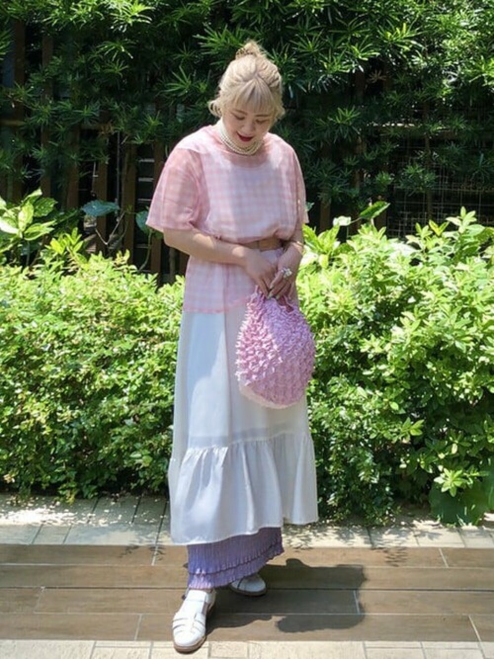 私事ですが、最近ピンクにハマっております。そんな本日はピンクにパープル、ホワイトと何とも女の子らしいスタイリングになってしまいました。笑 チェックのチュールTはレイヤード好きにはたまらないですね◎そんな私はワンピースの下にスカートを忍ばせ、本日もレイヤード祭りの開催です〜!