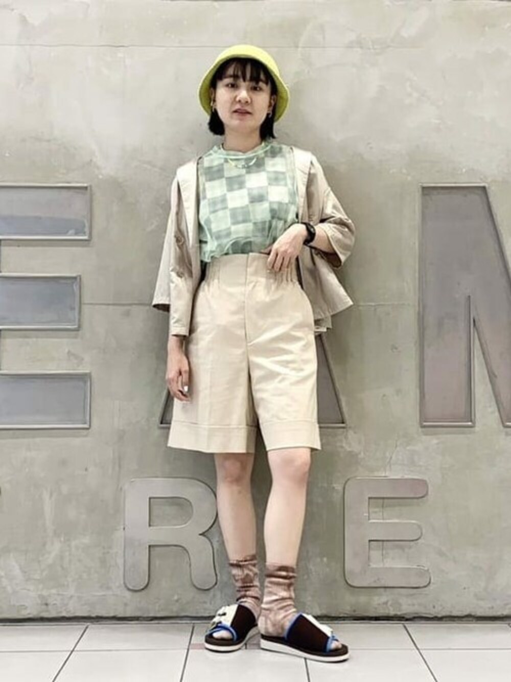 【近未来ストリート】半袖シャツにショートパンツ、サンダルってストリート感あるなあって個人的に思います。今回のポイントはインナーのレイヤードです!大きさの違うチェックを組み合わせてます。チュールTシャツは透け感があるので柄同士の組み合わせでもしつこくありません。〈SUICOKE(スイコック)〉のサンダルやチンツテーラーカラーシャツが近未来的であまりしない組み合わせだったので新鮮でした!笑 でも本当はレイヤードおばけ(褒めてます)STAFF 山本がスタイリングをほぼ考案してくれました!笑 テーマの指定もあったんですが、忘れてしまいました。笑