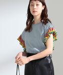 配色が可愛いフリルTシャツ。ボトムスや小物はモノトーンでまとめると、カジュアルさもおさえて着られます。腕周りもすっきり見せれるおすすめアイテムです♩