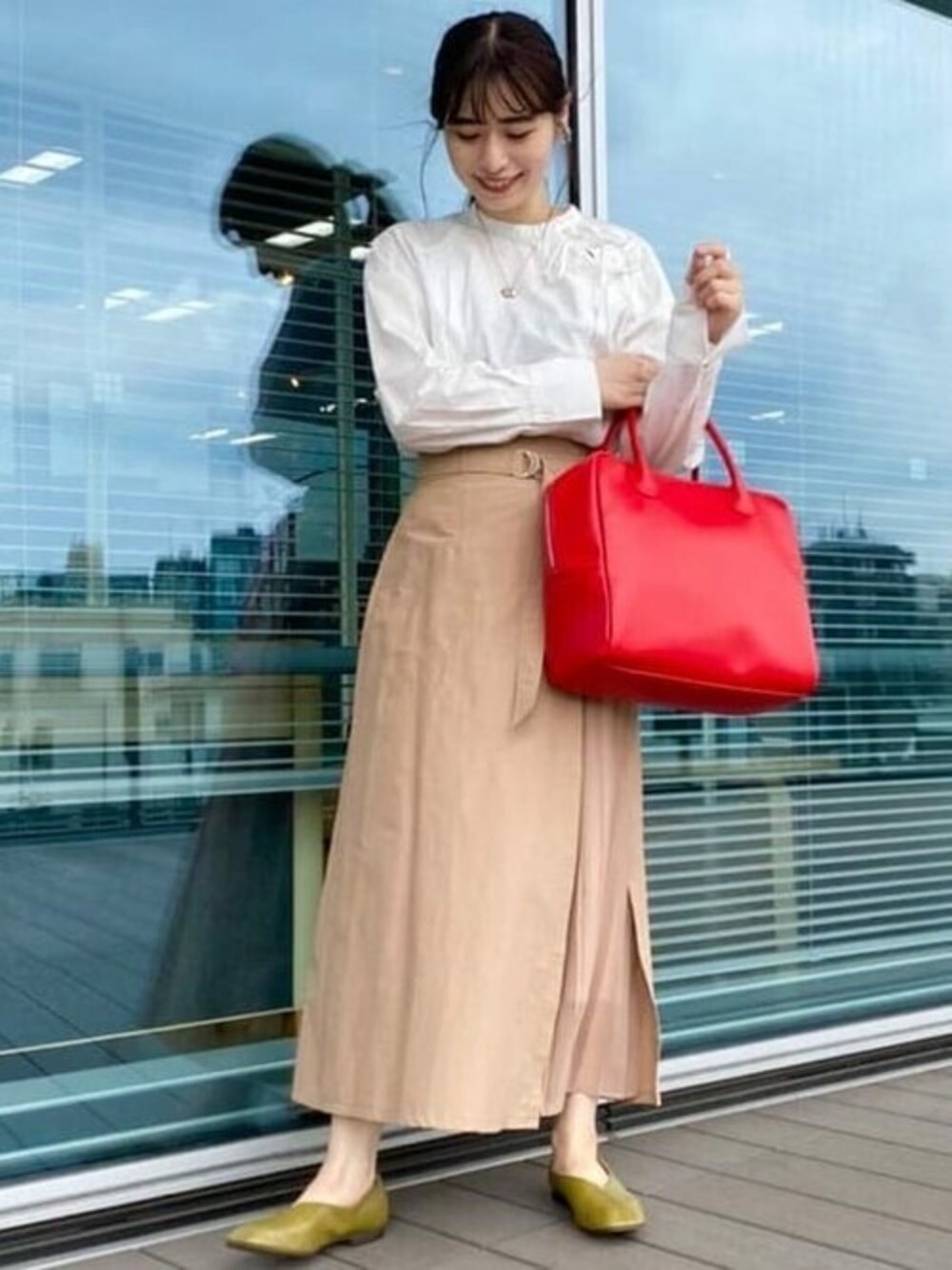 【速報21FW!可愛いでいっぱい♡】強風により髪の乱れ、失礼致します、、THEフェミニンなスタイリングですが、スクエアトゥのバレエシューズと赤のBIGボストンバッグでエッジでエッジの効いたアイテムをプラスしています♪