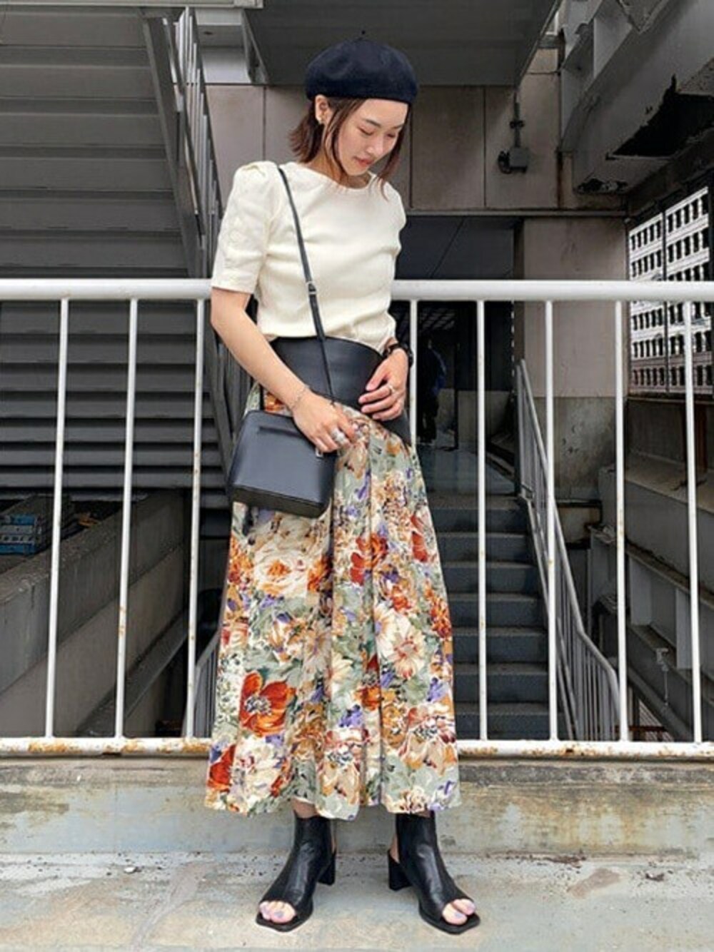 【古着mixコーディネート】 大きめにプリントされた古着の花柄パンツをメインにコーディネート。 テロッとした素材感だったので、少し綺麗めなアイテムと合わせてみました◎ 小物は全て黒でまとめております。