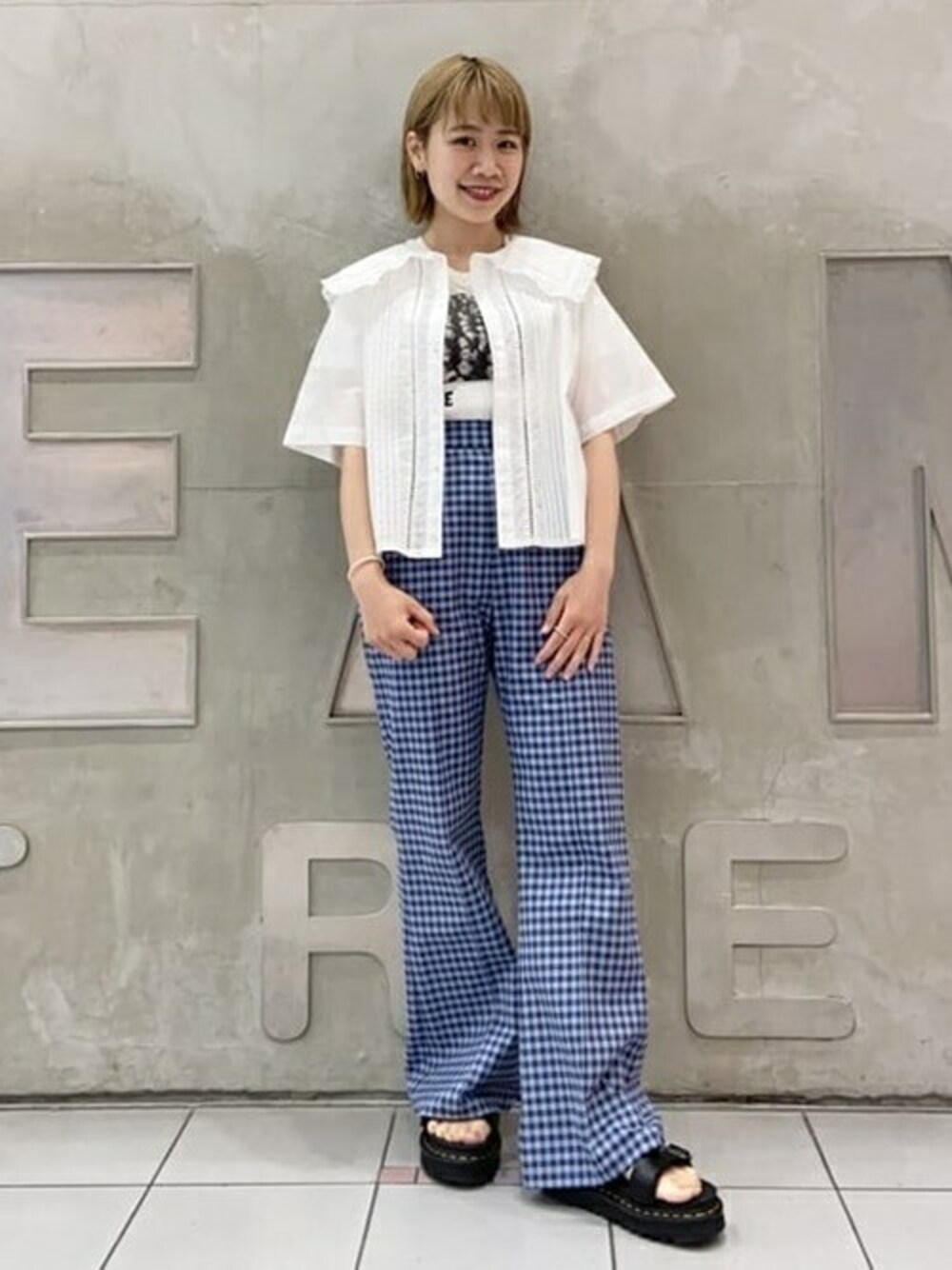 【こんなフレアパンツ待ってました!】 ギンガムチェック、ややハイウエスト、フレアシルエット、なによりストレッチ入りの大好きが詰まった美シルエットパンツ! 152cmの私は厚底のサンダルと合わせましたがブーツやヒールサンダル、スニーカーなんでも合いそうです! 可愛いビッグフリルカラーシャツを合わせて甘めに着ました! サラッとTシャツだけでも可愛いですね!