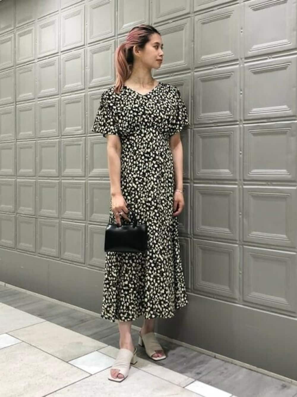 <Ray BEAMS>のオススメワンピースです♪可愛らしいフラワープリントと、私のピンクヘアにマッチするよう黒を選びました。足元はクリーム色で引き算してみました◎全体的に綺麗目お出掛けスタイルをイメージしました