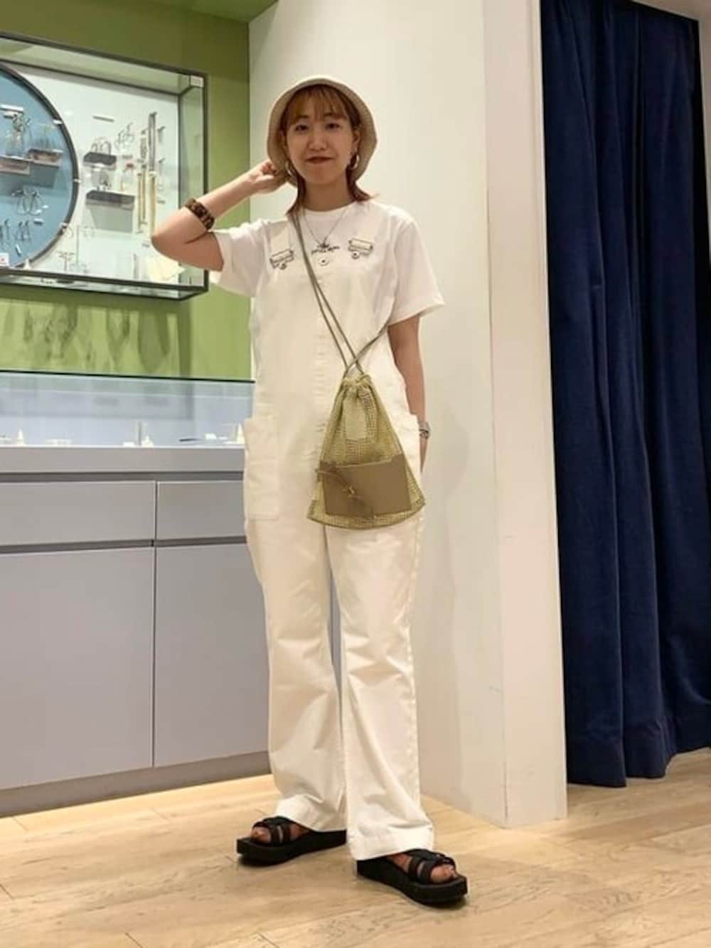 【ワントーンコーディネート♡】オーバーオールメインにTシャツを合わせた白のワントーンコーディネートです!(オーバーオールは、157cmでサイズ0を着用してます)アクセントに明るい色のバッグを合わせました!