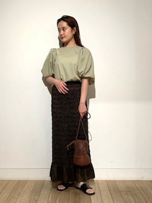 お気に入りのワンピースがセールアイテムになりました!程よい袖のボリュームがお気に入りです。あとポケット付きなのも♩ウッドのヘアゴムが相性抜群です!