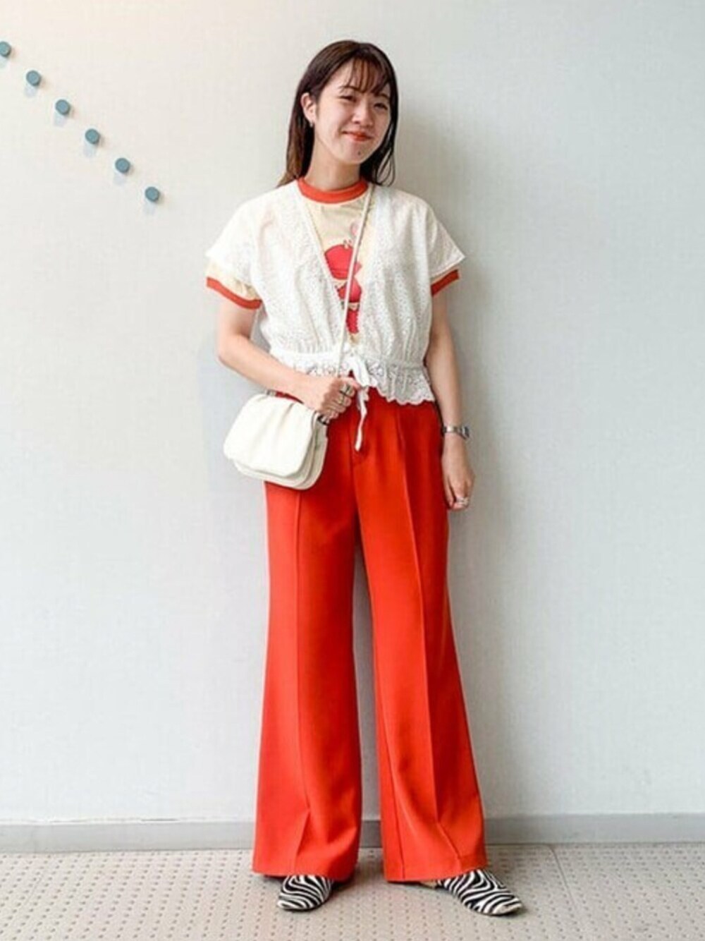 Tシャツのレイヤードスタイル!万能なブラウスをレイヤード。 オレンジのカラーをワンポイントに!夏らしくホワイトの小物を合わせました。