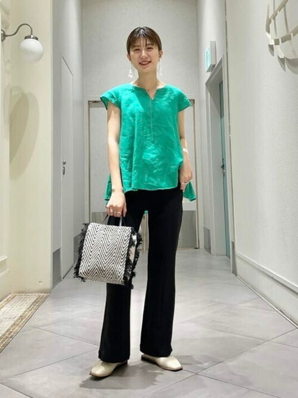 本日はちょっと大人っぽく、、トップスは色も形もキレイです! 首元も空きすぎてないVカットのデザインが◎後ろの丈が少し長いのでパンツとの相性も良いですよ〜♡ イヤリングは白の大振りでパッと存在感を♡足元も明るめカラーで抜け感意識しました♪