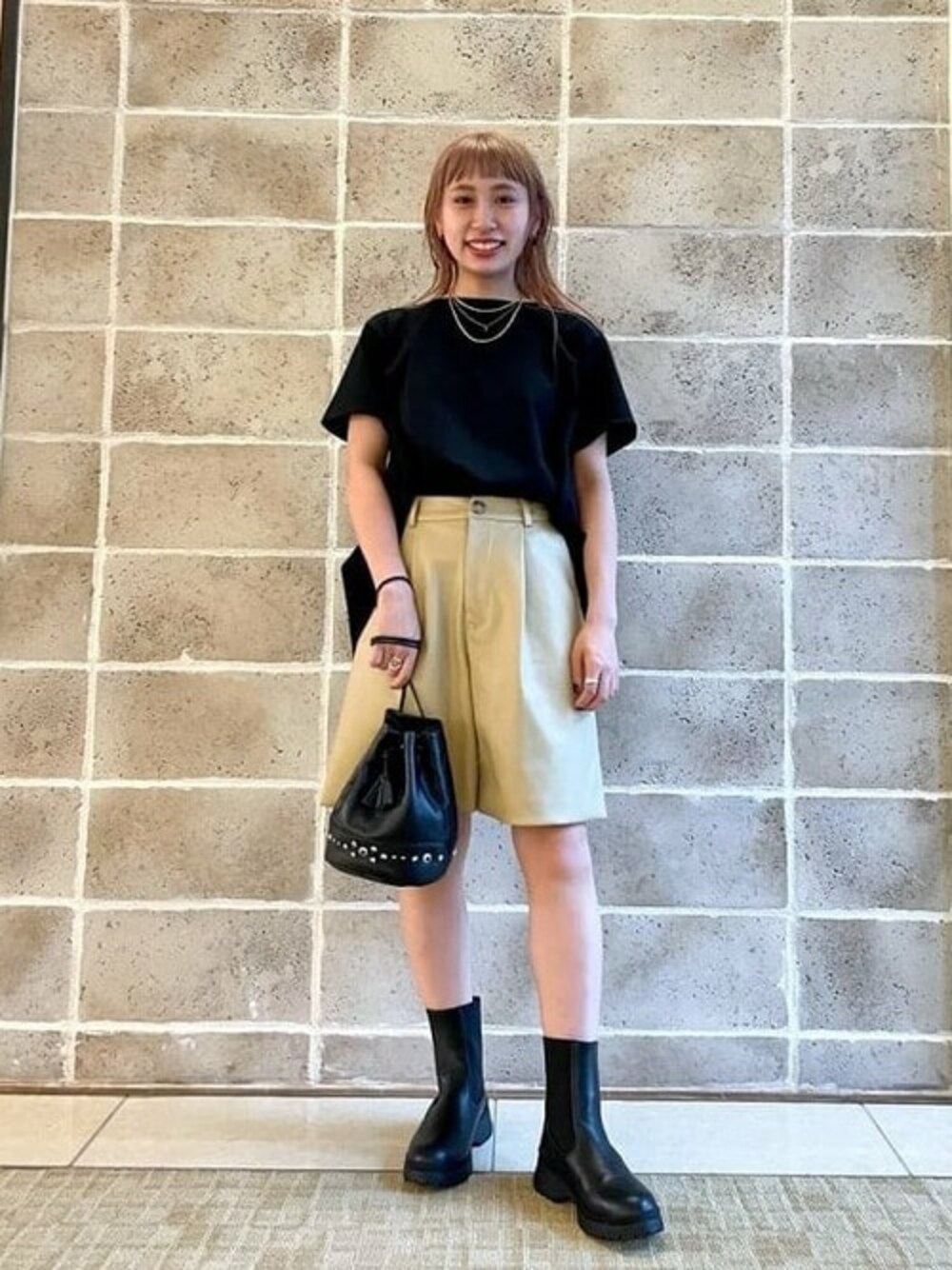 狙っていたショートパンツ!他のアイテムはブラックベースにして、シンプルだけどトレンド感のあるコーディネートにしました☆Tシャツはあえて前だけタックインしバランスを取りました。
