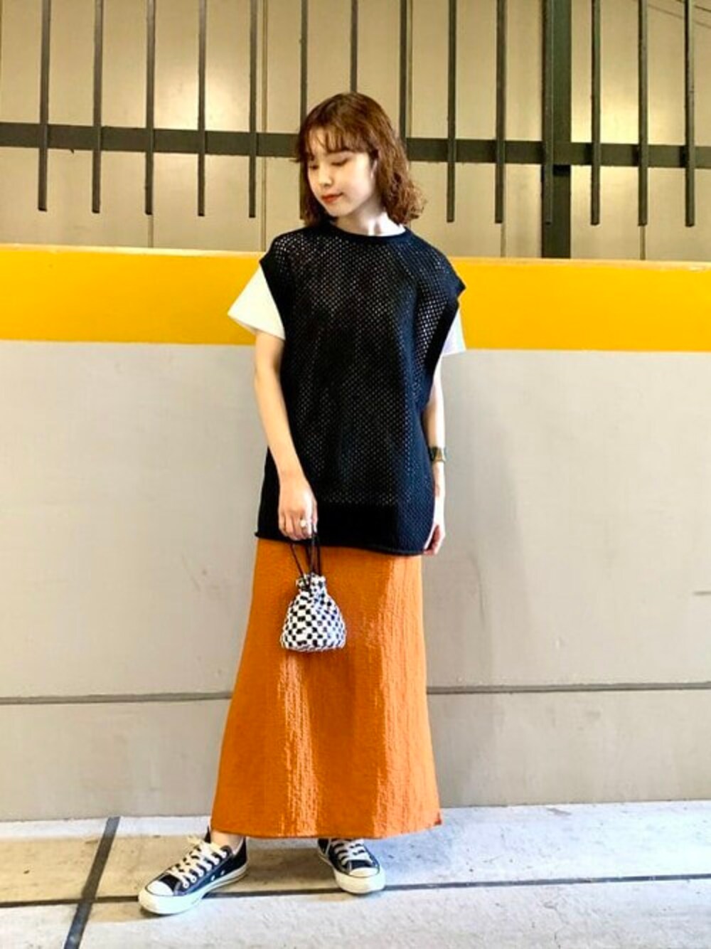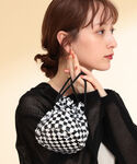 インパクトのあるバッグプリントを、ベストから覗かせてレイヤードしました。 <Casselini × Ray BEAMS>のキラキラポーチは、アクセサリー感覚で持つと可愛いです!